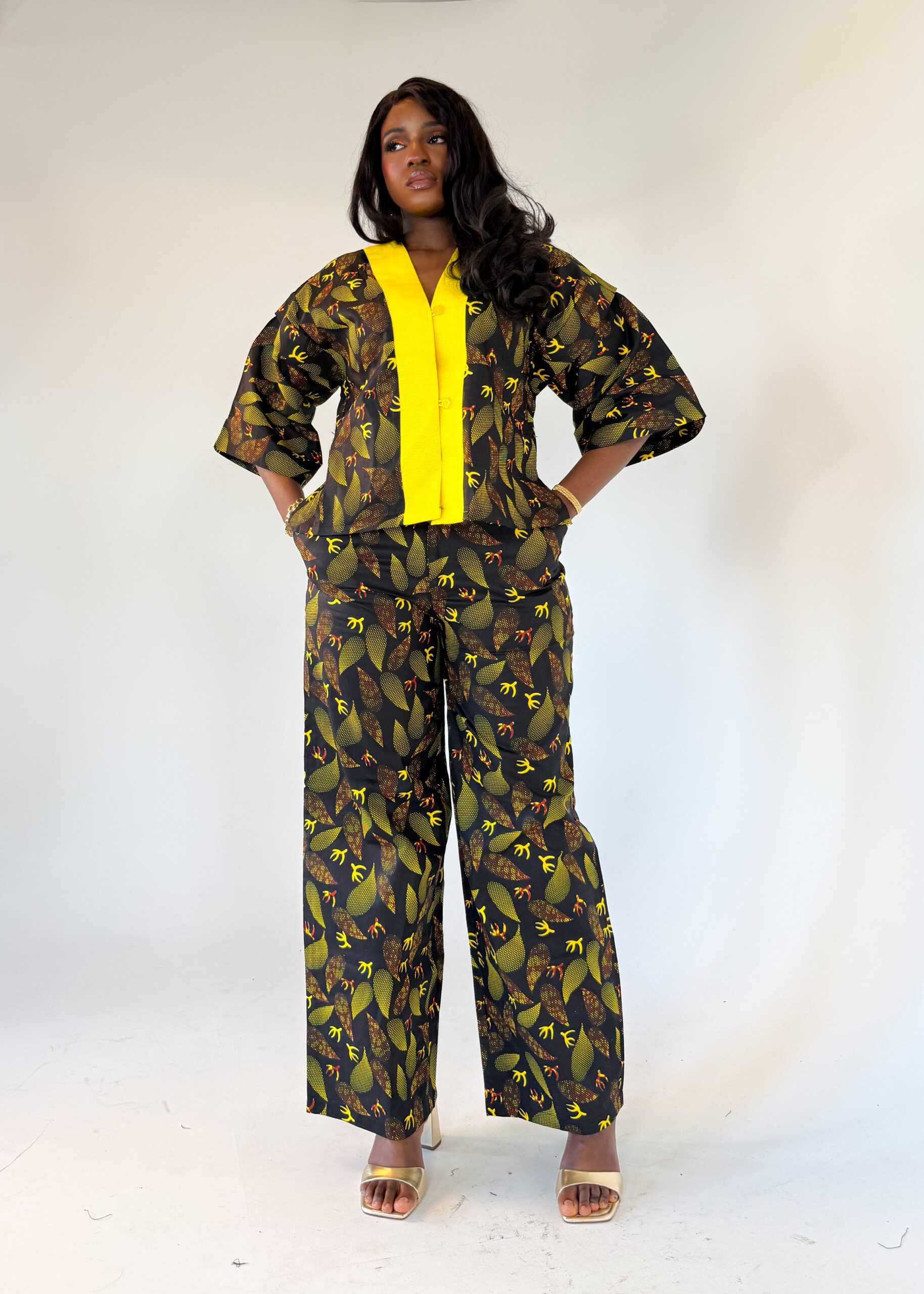 Ankara pant set, designed to make statement and comfortability, pant has a band and a front zipper, features with pockets. Blouse is a free top with wide midi lenght Sleeves mixed with high quality asooke to suit your style.