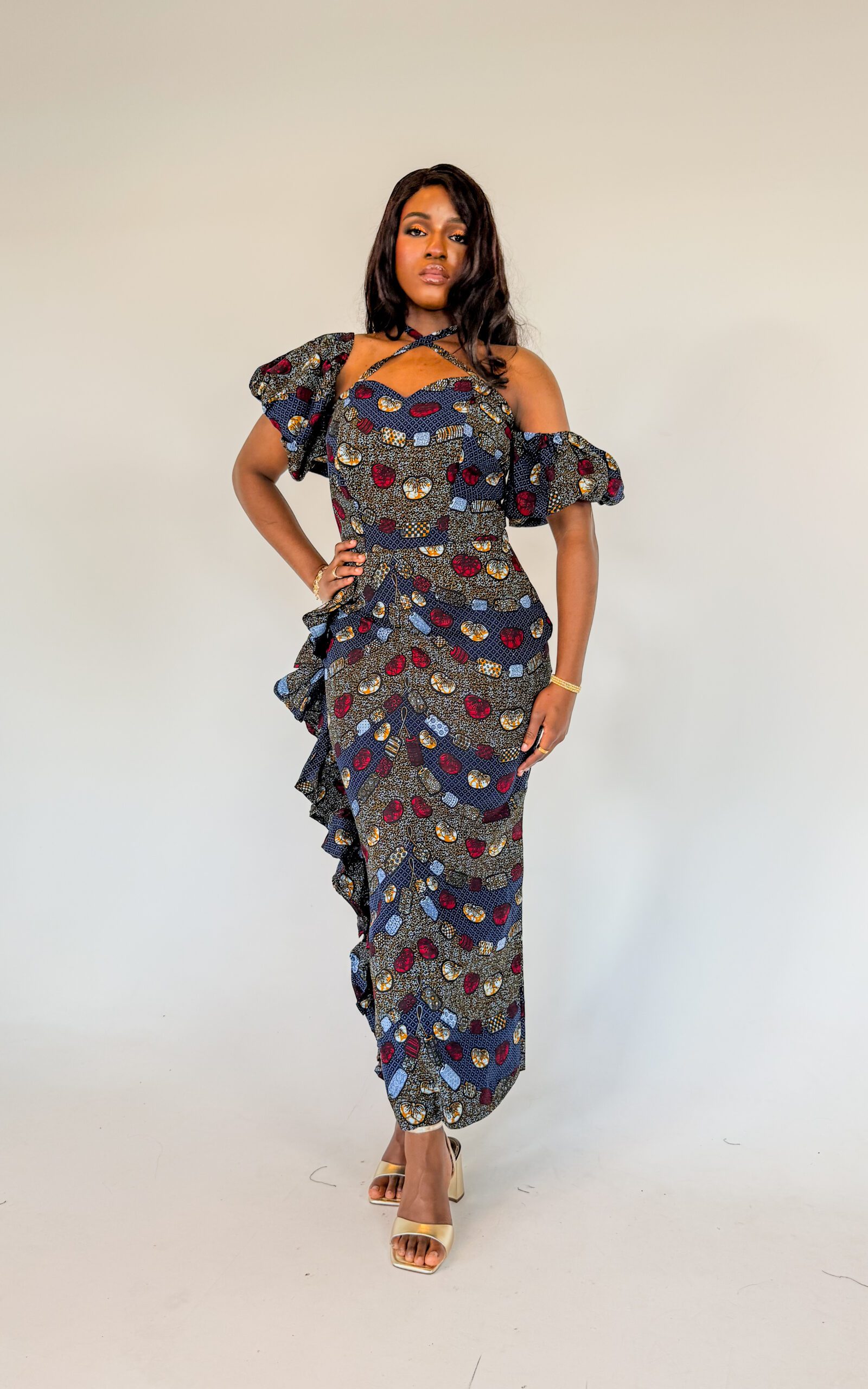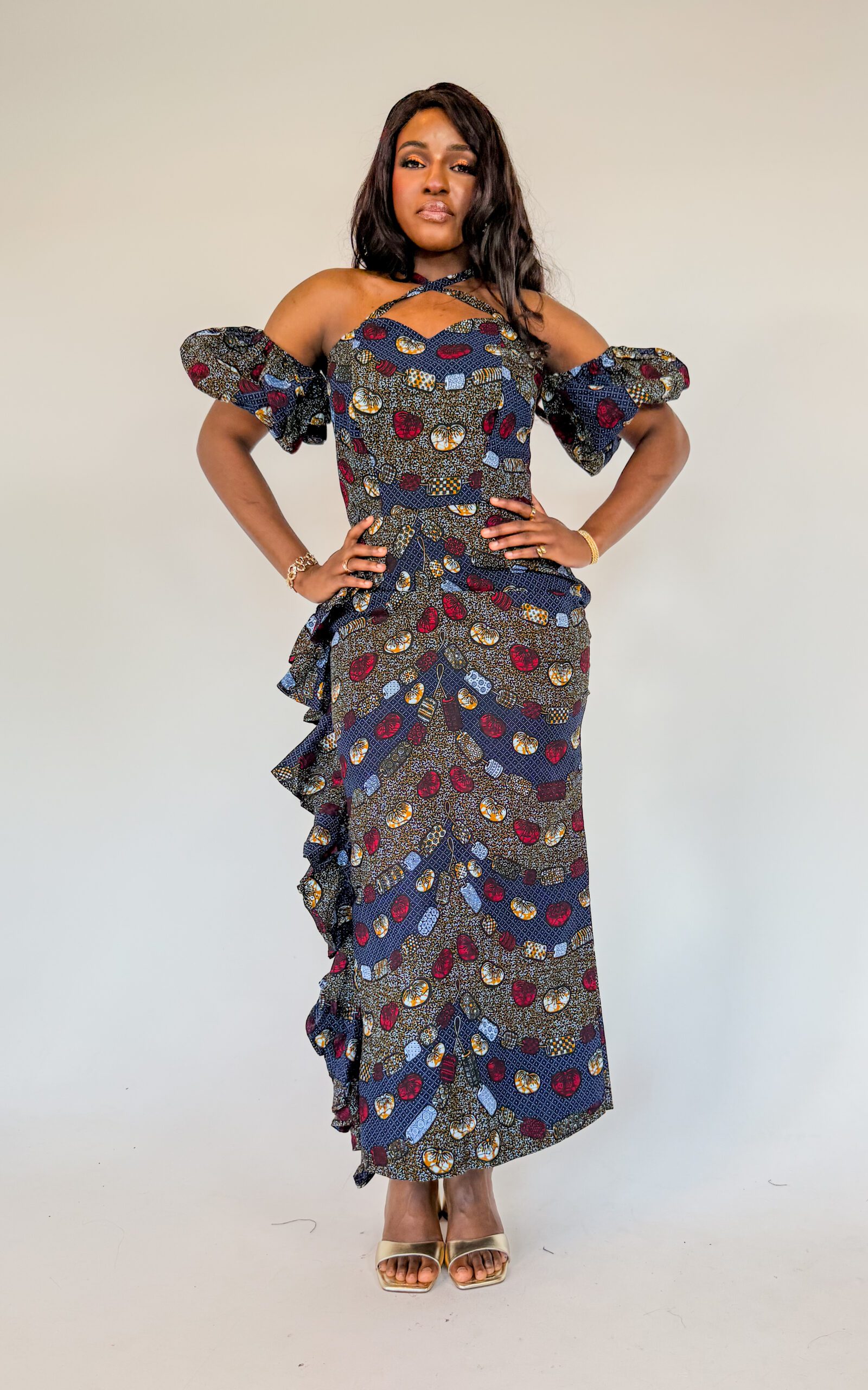 Ankara fitted dress , designed to make statement and comfortability, features adjustable rope on the neck. Sleeves has and elastic can be adjusted to suit your style.