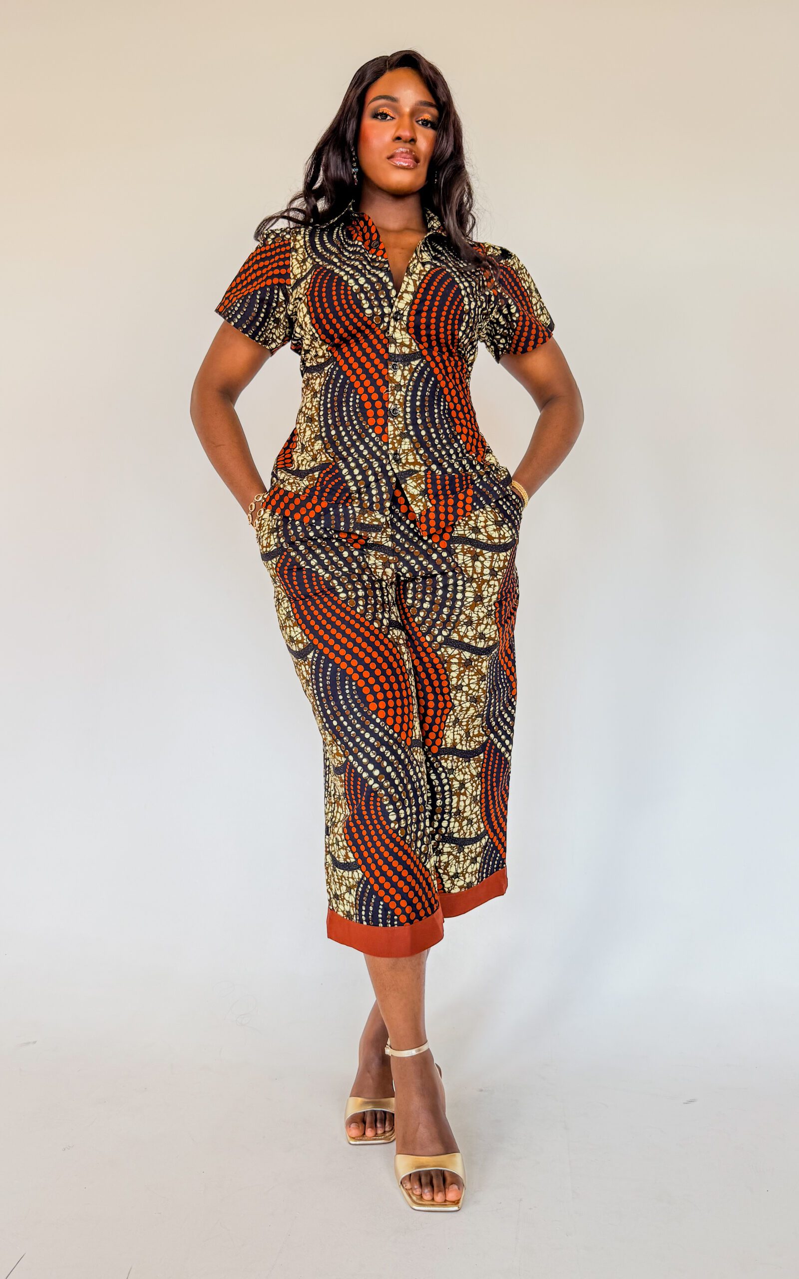 Ankara pants set, designed to make statement and comfortability, Pant is a midi lenght, with elastic band and features with pockets.Shirt has a fitted sleeves and a little band with adjustable buttons for a perfect fit to suit your style.