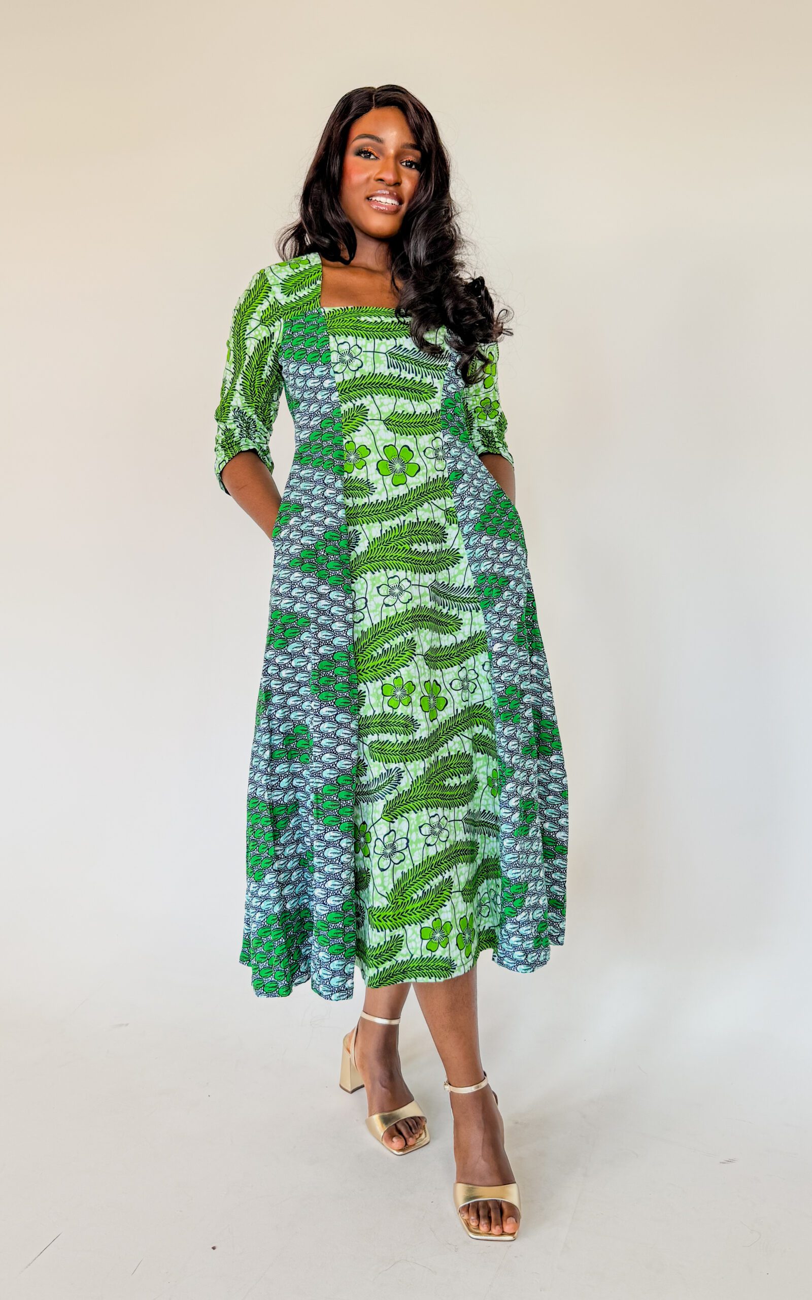 Ankara mix and match flare dress, designed to make statement and comfortability, features with side pockets, Sleeves has little elastic detail to suit your style.